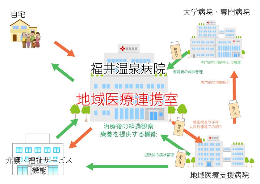 福井温泉病院の地域連携室では、地域の医療機関と協力して、患者様に最適な医療を提供しています。