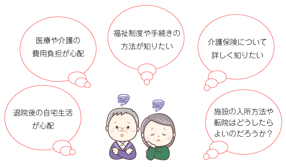 「どこに相談すればいいか分からない」「退院後の生活が不安」「介護サービスについて知りたい」など、どんな小さなことでもお気軽にご相談ください。