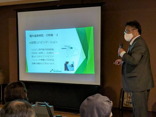 第19回 福井温泉病院ひろば 第19回健康教室を開催しました。 開催日時: 2025年10月11日(土)10:45~ 開催場所: 春江亀ヶ久保ふれあい会館 今回のテーマは当院理学療法士による「腰痛について」。 腰痛になる要因や予防方法、普段の生活で気を付けることなどをご紹介。 またご自宅でも気軽にできる腰痛体操を参加者で体験しました。 約40分ほどでしたが、身体を動かすことによりリフレッシュできた時間となりました。